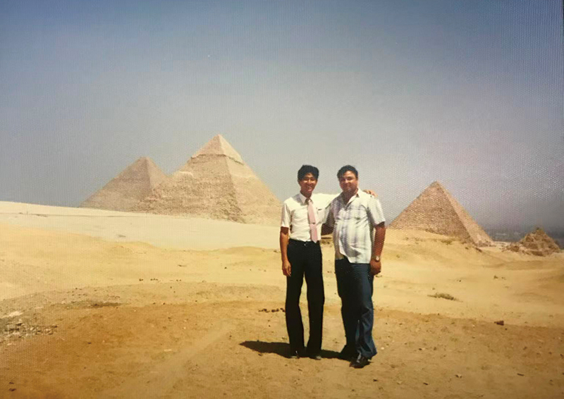 エジプト出張での1枚。その後のアメリカ・ジョージア工場での5年間の駐在経験を経て、三現主義で仕事を進め、何事もオープンに協議するマインドを醸成できました。